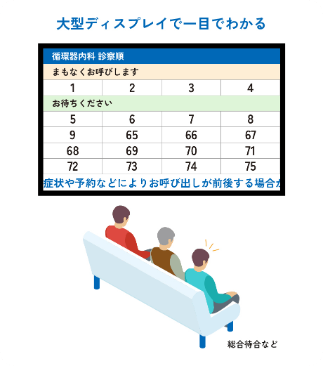 総合待合や中待合に設置した大型ディスプレイに現在の診察待ち状況が一目でわかるように受付番号を表示します。